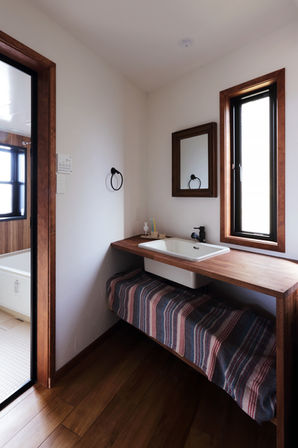 横浜の眺めの良い高台に建つ住宅。2階リビングを取り巻くようにウッドデッキを設置して、中外が一体の空間となるように設計。アジアリゾートの雰囲気のあるスタイルで、木目の美しさと経年変化を楽しめる住宅である。